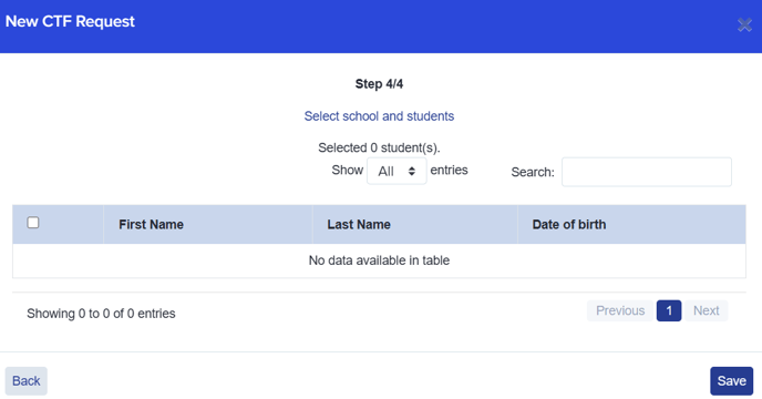 A table summary by schools will show, and you can now select to whom you'll send the request. Select all using the checkbox on the left of the table, and hit “Send”. A message should appear to say the request has been sent.