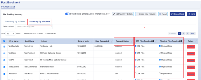 When you click back to 'Summary by schools', you will also see how many files are missing or received. You can resend the request from here by selecting the school(s) you wish to resend the requests to, then click 'Resend To All'. You can also just re-request those files which are yet to be received, by clicking “Re-request Missing”.