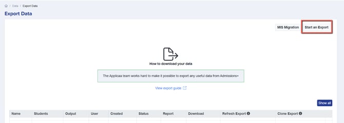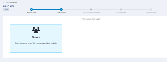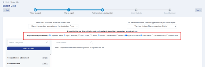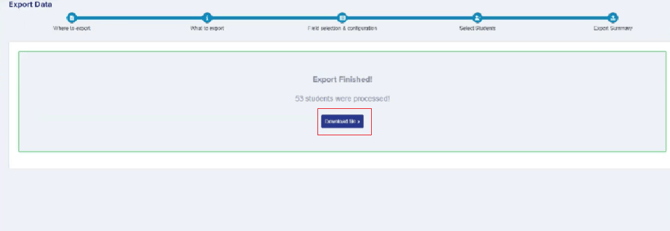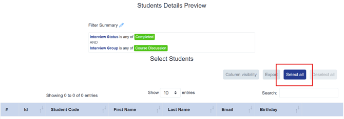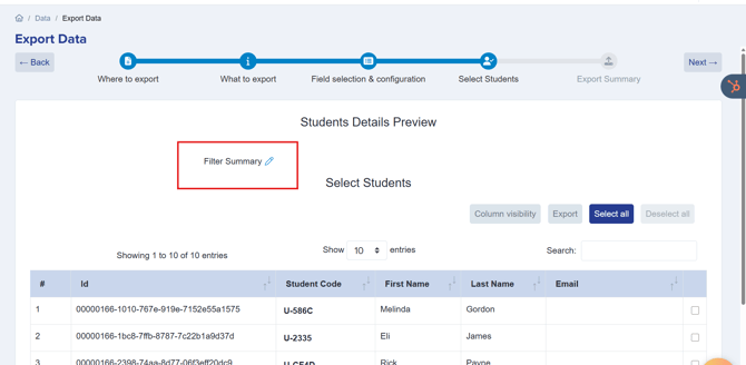 Once you are happy with the information displayed after filters are applied, click Select All to ensure all relevant students are included, then click Next to complete the export.