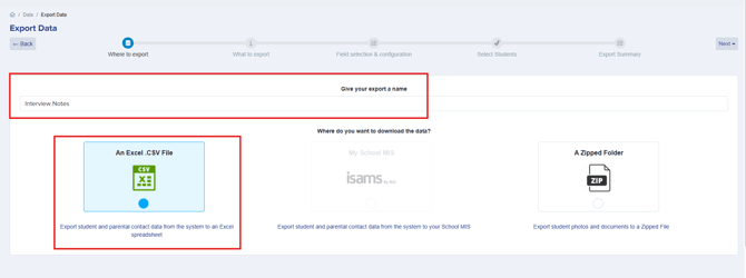 Name your export (e.g., Meeting Notes) and choose CSV as the file format then click Next.