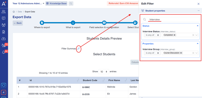 Go to Filter Summary to refine your export by filtering students based on their Meeting Status (e.g., Completed). If applicable, select a specific Meeting Group (e.g., Students from a particular meeting).