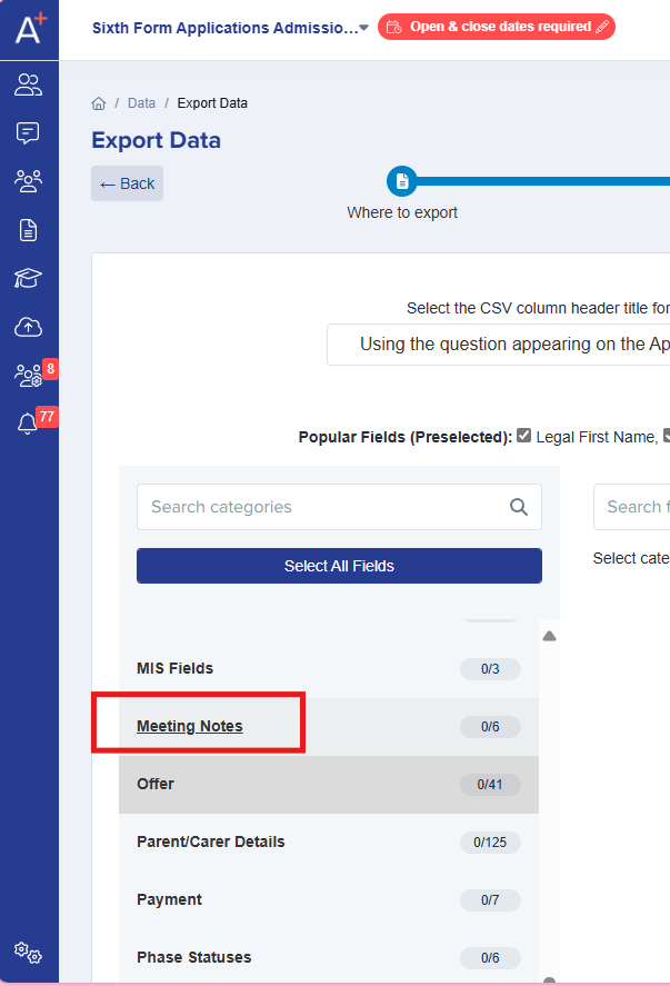 From the upper section, remove any unnecessary pre-selected fields from your form and choose only those related to meetings. Simply untick properties you don’t want to include in your export, and tick those you do wish to include.