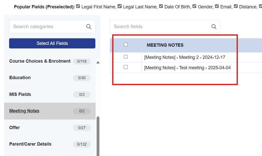 On the left side, look for field that contain "meeting" (Meeting Notes).