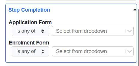 Application Form Phase – Filter applicants by which steps have been completed, not completed, or by the total number of steps completed. Options include is any of, is none of, is equal to, and less than.