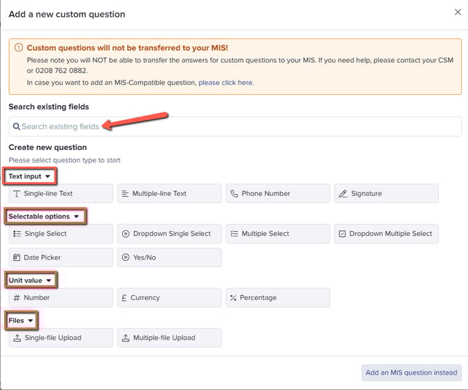 For custom questions, you can choose, text, number, currency, date or any one of these other options, depending on the data that you're collecting.
