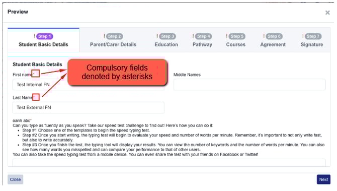 Here in step one - basic details, address, telephones and email addresses, concessions, ethnicity and so on - from the admin view, this is what it looks like.