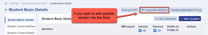 Customise Sections - This is the option you use if you’d like to add another section to the step you are working on. Once a section has been created, individual questions can then be added to it. This is where you can also sort your sections accordingly.