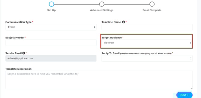 Fill in the required information and under the Target Audience, select Referee in the drop down. Click "next" to proceed.