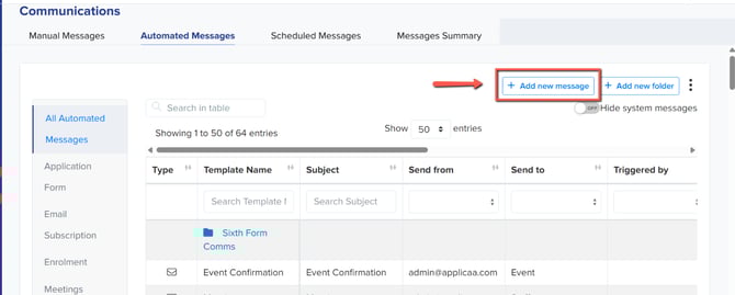 In Automated Messages, click on the "+Add new Message" button to create a new template.