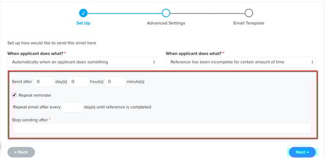 Set the start date for when the email should begin sending and the end date for when the automated emails should stop (for example, after the deadline for reference form submissions has passed). You can also make the reminder email keep sending after every set number of days until the reference has been completed.