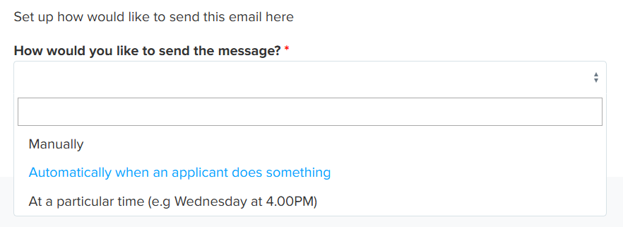 In Advanced Settings under "How would you like to send the message?" select on the drop down "Automatically when an applicant does something".