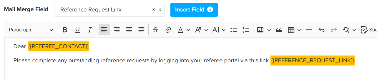 You are able to insert mail merge tokens to personalise the message and provide the referee with the required information to complete your request.