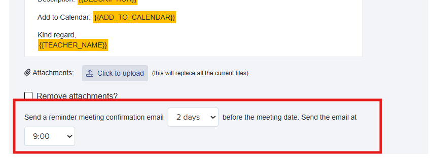 Likewise, you may also automate a reminder email to students who have yet to confirm their attendance to the meeting. To do this, simply toggle the Reminder email to unconfirmed students button on.