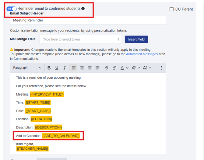 In addition to these emails, you may automate a reminder email to be sent out to students who have confirmed their attendance, notifying them of the upcoming meeting. To do this, simply toggle the Reminder email to confirmed students button, and you can opt to cc parents as well if you wish.