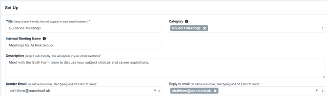 If the meeting is being set up in a parent-facing form (such as Year 7 Admissions), the recipient of the invitation will automatically be the parent instead of the student.