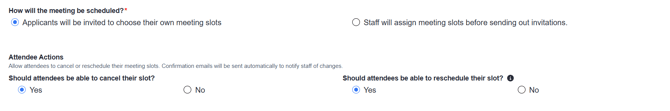 Attendee Actions - here you can choose whether invitees will have the option to cancel a scheduled appointment, and if you choose the configuration "Applicants will be invited to choose their own meeting slots", you will also have the option to allow them to reschedule their appointments.