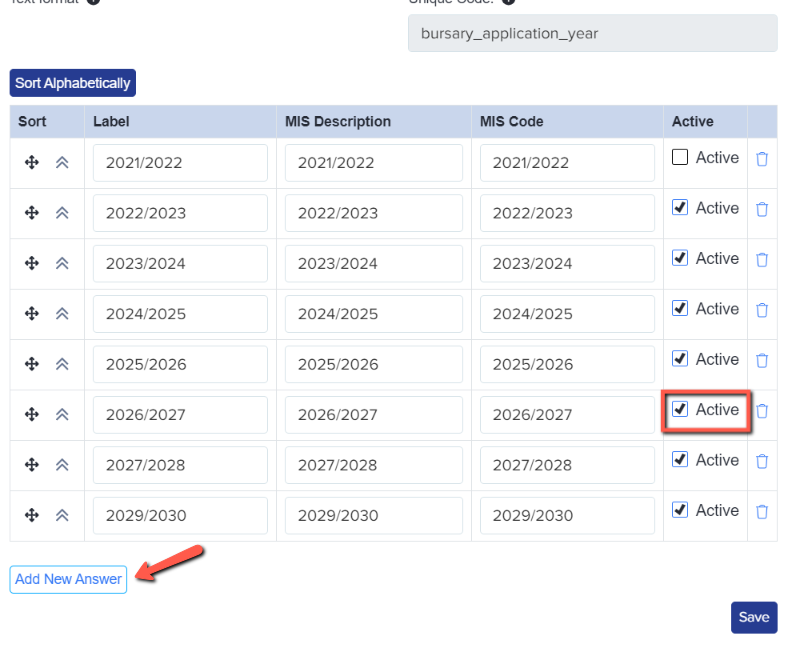 If the new year is not yet added, use the Add New Answer button to add the new year to the list.