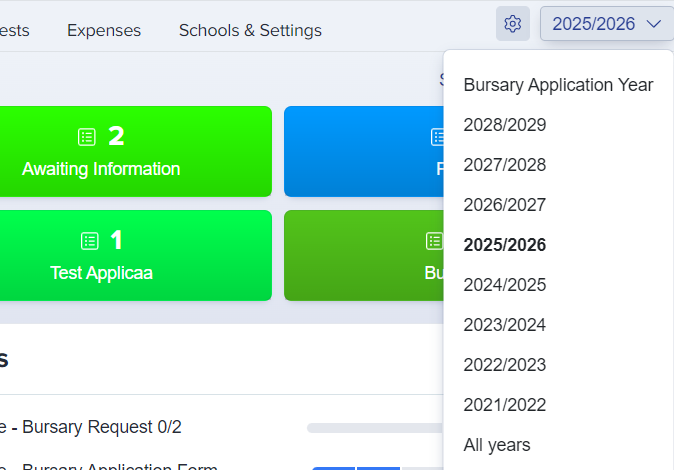 When you return to your Dashboard, your new Academic Year will be visible in the top right corner of your screen, only when at least one student has renewed their bursary or you have received new applications for the new cycle. You may create a test student to kick start this.