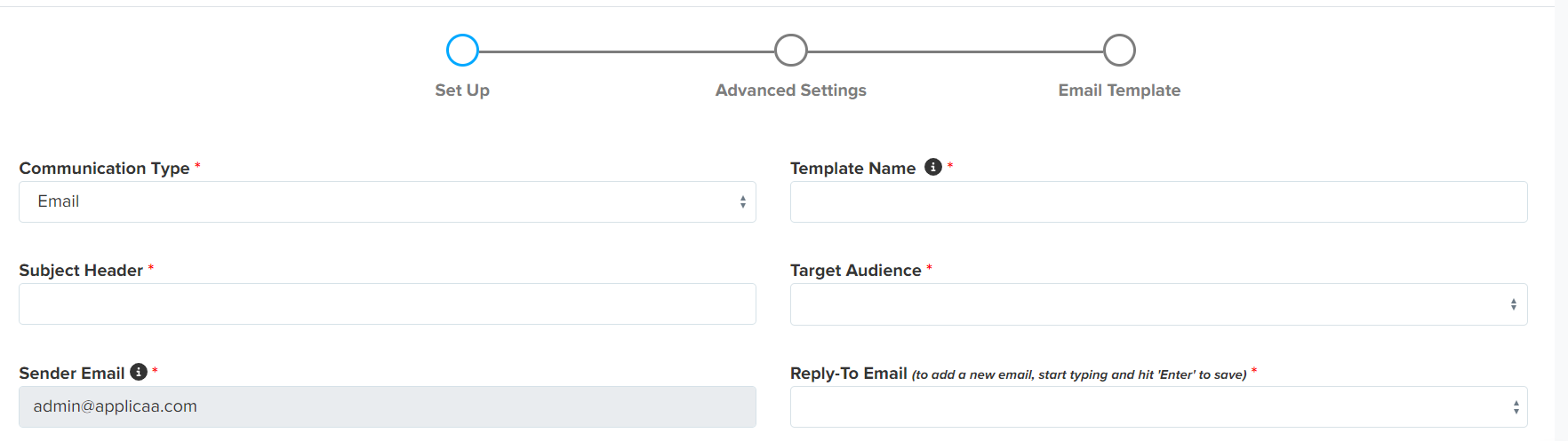 In composing an email template, you need to complete all asterisked fields in the setup screen.