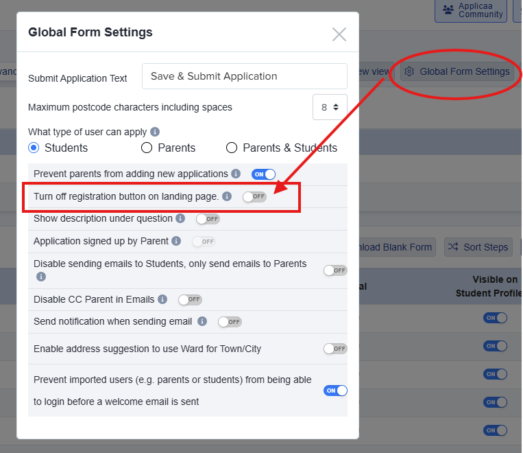 Click on "global form settings" to turn on "Turn off registration button on landing page". This will turn the button on your landing page grey when activated.