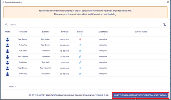 Select students who have already been imported to SIMS by clicking on Send The Data Just For The Students Already In SIMS.