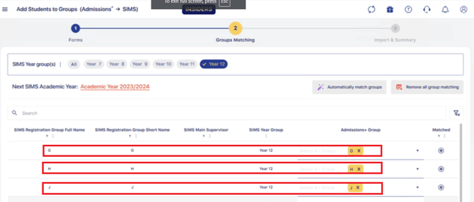 You'll then see a page where you can start to filter and match your Admissions+ form groups with your SIMS form groups. Make sure to select the correct Admissions Year and also the Year Group that you're looking at. After that, you can go ahead and click on Automatically match groups and then Next.