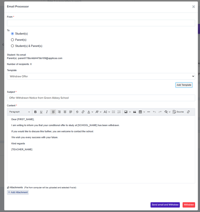 If you change the student's status to "Withdraw Offer" an email processor page will pop up giving you an option to inform the student and/or their parents regarding reason for withdrawal via an email.
