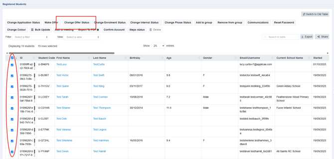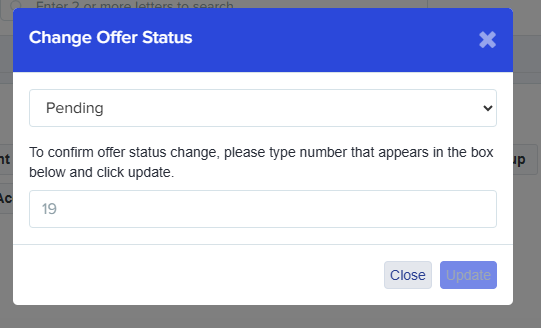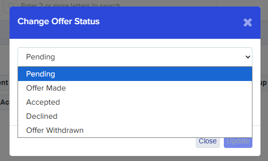 Once a selection has been made the "Change Offer Status" button will appear on the top of the table. After clicking the button, it will show you the different status options that you can select.
