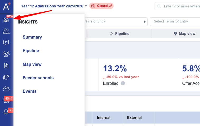 The Insights area is a powerful analytics dashboard designed to help you monitor and optimise your admissions and marketing pipeline. Located in the top left-hand side of the blue menu within the Applicaa dashboard, Insights provides real-time visibility into your school's recruitment performance.