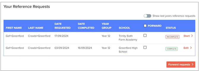 The student may appear multiple times in the dashboard—once for each school application that requires a reference.