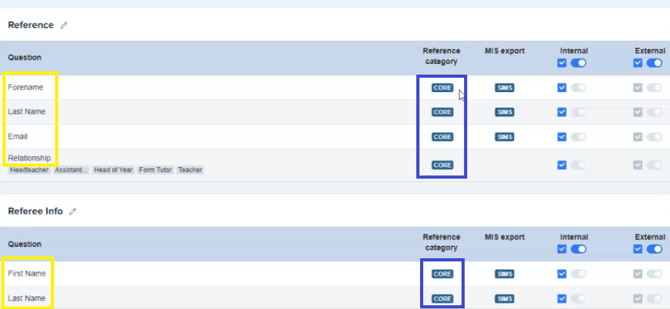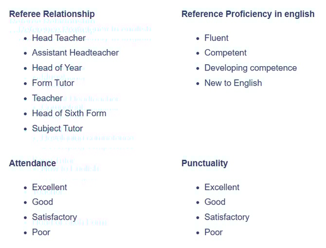 In order for you to maximise the benefits of automated reference completion, the core and common questions on your reference form should use a standard set of lookup values (those used by the vast majority of schools). Please see the standard list below: