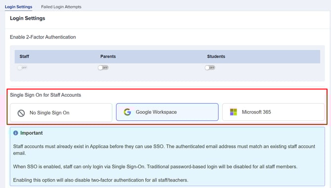 Note: When SSO is enabled, two-factor authentication (2-FA) is automatically disabled for staff accounts.