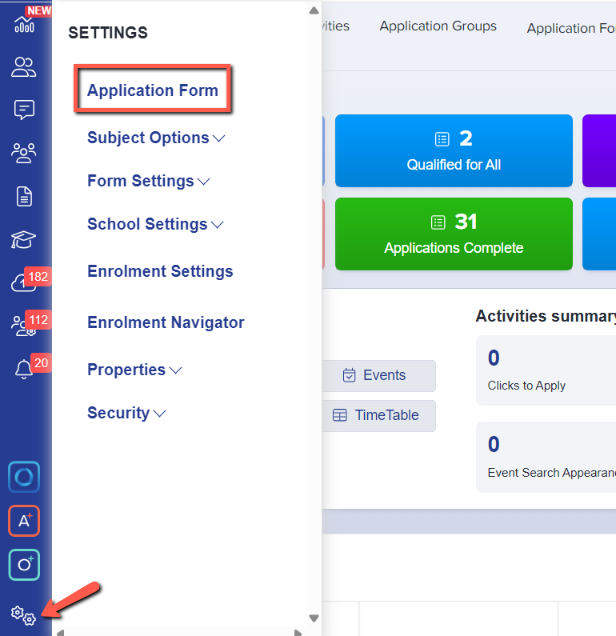 In order to get to courses click Settings on the lower left part and then select application form.