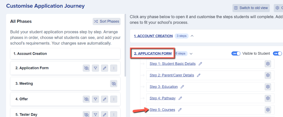 Once you are on the application form area - select the Courses step, where you can review and customise your settings.