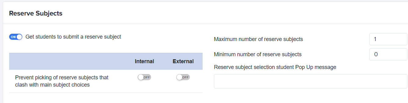 This area enables students to choose reserve subject(s), and you can set a minimum and maximum number of reserved subjects as needed.