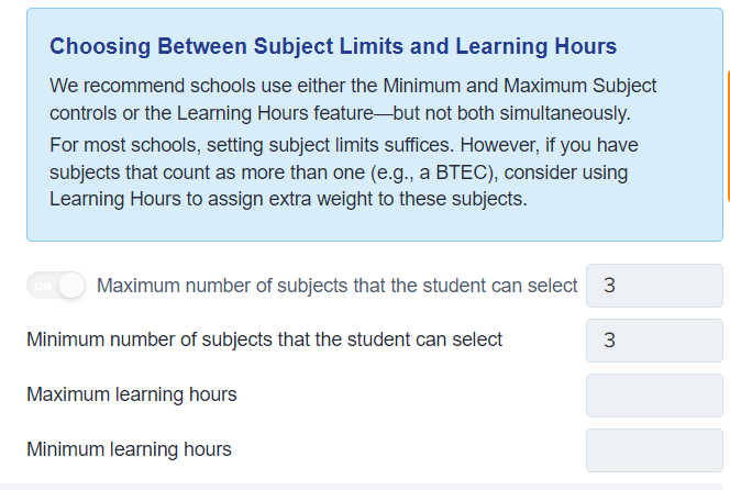 You can limit the number of choices an applicant is able to make; either by the number of subjects or by the number of learning hours. You would make use of the Learning Hours options if you offer courses which are worth double or triple a single A Level or equivalent.