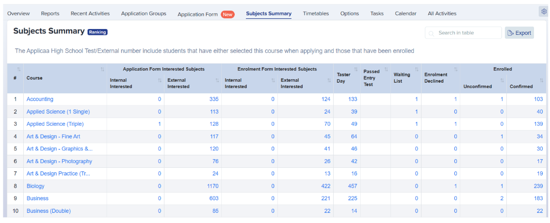 From your main dashboard, click the "subjects summary" tab. This will take you to the bottom of your dashboard, to view a table of your subjects and a breakdown of which applicants have opted for each course.